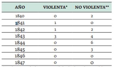 Entre 1844 y 1847 es posible apreciar un cambio significativo en la acción colectiva de los esclavizados, libertos y manumitidos del suroccidente de la Nueva Granada. A pesar de que en el periodo de 1840 a 1843 la acción colectiva violenta se incrementó, la acción colectiva no violenta14 permaneció vigente durante estos años y, a causa de la eficiente represión de las élites a la movilización de la población de origen africano, se intensificó a partir de la expedición de la ley del 22 de junio de 1843.