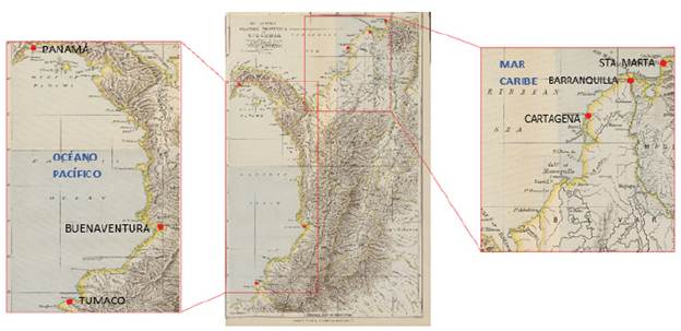 Ese mismo año, el Gobierno colombiano impulsó la modernización de los puertos. Su objetivo era ofrecer seguridad al tráfico marítimo y comodidad en los puertos nacionales. Los trabajos incluían el establecimiento de faros, boyas y cualquier otra forma de señalización que indicara la entrada a los puertos y los lugares peligrosos para la navegación. Empero, estas decisiones no fueron espontáneas, más bien respondieron a un proceso de amplia duración relacionado con la transformación de la locomoción. El objetivo de este artículo es, entonces, mostrar la transformación de las ayudas a la navegación en Colombia entre 1876 y 1930, es decir, desde la instalación de las primeras torres lumínicas hasta los proyectos de infraestructura gubernamental implementados en las costas Atlántica y Pacífica. Para ello, este trabajo se centrará en los puertos de mayor relevancia para el periodo: Cartagena, Barranquilla, Santa Marta, Panamá, Buenaventura y Tumaco, que se señalan en el mapa presentado a continuación.