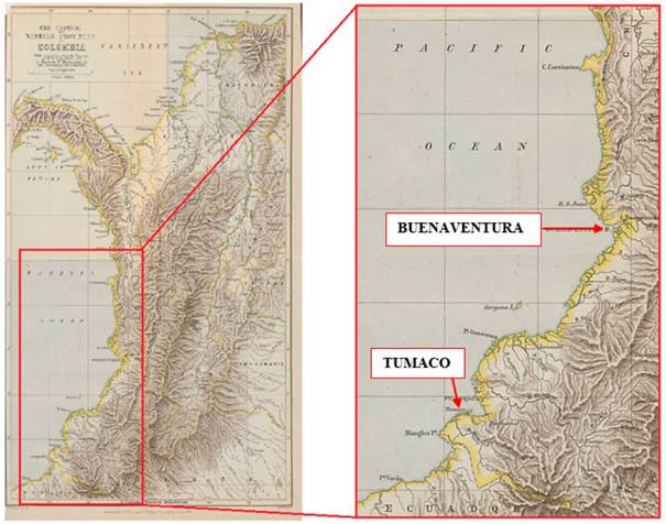 La separación de Panamá implicó que los puertos de Tumaco y Buenaventura, sobre el océano Pacífico, recibieran mayor atención. Estos puertos, señalados en el mapa 6, eran de menor envergadura en el siglo XVIII y a mediados del XIX, aunque a través de ellos se exportaba la producción minera del litoral pacífico. De hecho, allí el interés de los empresarios por la construcción de ayudas a la navegación había sido reducido. Según el ministro de Fomento en 1873, el menor número de embarcaciones que llegaban allí no impulsaron el interés de los comerciantes por la construcción de faros que les fueran rentables24.