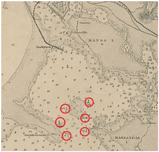 además ella (la luz que se pusiera en Isla Verde) permitiría a los buques que se arriman durante la estación de los vientos fuertes del N.O. ponerse al abrigo que les brinda la costa contra la fuerte marejada, bien sea para esperar el día, o bien para entrar en el puerto guiado por ambas luces4.