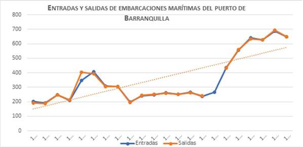 Por otra parte, la locomoción a vapor fue fundamental en el crecimiento económico del siglo XIX colombiano, pues permitía conectar los mercados internacionales. El rol de los puertos en el proyecto de modernización creció en importancia en las últimas décadas: en la Costa Atlántica se situaban los puertos de Santa Marta, Cartagena y Barranquilla, y en el Pacífico, Panamá y Buenaventura. El caso de Barranquilla ilustra bien el proyecto de modernización y su relación con el comercio. Como se puede apreciar en el gráfico 1, durante 50 años la frecuencia de las embarcaciones marítimas aumentó. Durante la década de 1870 menos de 250 embarcaciones llegaron al puerto anualmente, mientras que una década más tarde esta cifra se elevó hasta llegar a 400 viajes en 1880, y se incrementó en la década de los 90, pues entre 1892 y 1893 entraron 442 barcos al puerto, y entre 1894 y 1895 fueron 510. Para finales de la década del 1920, las entradas al puerto de Barranquilla se habían duplicado, siendo para 1924, 436 y para 1930, 650.