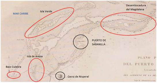 El aumento del comercio estuvo relacionado con la tecnificación de los puertos y el establecimiento de ayudas a la navegación. El puerto de Sabanilla (Puerto Colombia) era el establecimiento marítimo más cercano al puerto fluvial de Barranquilla, como se aprecia en el mapa 3. Desde allí se trasladaban las mercancías de forma terrestre (primero con un camino terrestre y luego con el ferrocarril) hacia Barranquilla y, después, al río Magdalena, principal arteria fluvial del país. Como se puede apreciar en el mapa 4, el ingreso al puerto de Sabanilla presentaba dificultades a la navegación por Bajo de Culebras, la isla de Arena y la excesiva sedimentación en el norte, cerca de la desembocadura del río Magdalena. Mientras estos accidentes geográficos podían ser fácilmente visibles durante el día, y servían de puntos de referencia para guiar al navegante, en las noches podían significar riesgos para la llegada al puerto.