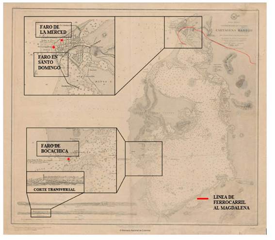 Los empresarios de Cartagena, al igual que en Santa Marta y Barranquilla, se involucraron en la construcción de ayudas a la navegación. En 1882, los empresarios Juan Bautista Mainero y Trucco y Darío Alberto Henríquez pusieron en funcionamiento un fanal de luz giratoria en la torre de la iglesia del antiguo convento de la Merced, dentro de las murallas del centro de la ciudad (Urueta, 1912, p. 126). Este primer fanal pero el interior quedaba en la oscuridad. Entonces, en 1884 Mainero construyó un fanal en Bocachica, en el Castillo de San Fernando. Según las indicaciones marítimas, la luz era cuatro veces mayor de la que necesitaban los marinos para atravesar el canal, alumbrando, además, la parte interior de la bahía hasta el bajo de Loro y Cospique. Así, después de atravesar el canal: "guía al navegante el otro Faro (el de Cartagena) y por consiguiente, la nave puede navegar toda la bahía sin el menor riesgo". (Urueta, 1912, p. 128). En la ilustración 1 es posible apreciar la ubicación del faro de la Merced, posteriormente trasladado al baluarte de Santo Domingo, y al sur de la bahía, el de Bocachica. Además, se señala la conexión de los puertos de la ciudad con el ferrocarril que comunicaba al río Magdalena.