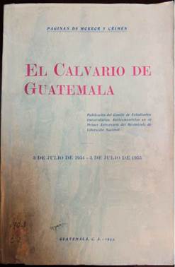 El calvario de Guatemala. Publicación del Comité de Estudiantes Universitarios Anticomunistas en el primer aniversario del Movimiento de Liberación Nacional. 3 de julio de 1954 - 3 de julio de 1955, consta de 397 páginas en papel fino de 6 3/4 x 10 1/4 pulgadas, el tiraje de 15 mil ejemplares, se imprimió en dos tandas, la primera de 10 mil y el resto en la segunda. El libro está dividido en 2 partes, 5 apéndices, 3 apartados y, en este caso, sí se incluyó un índice al final. En esta publicación las imágenes se intercalaron con el texto por lo que su interacción con lo escrito es constante. En la portada predominan los elementos tipográficos dispuestos en diversos tamaños, no contiene imágenes. En la parte superior, una leyenda adelanta el contenido de la obra: "Páginas de horror y crimen", seguido por el título y subtítulo, cierra con el lugar y año de publicación.