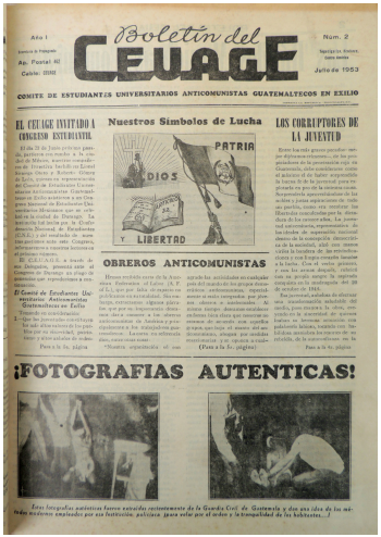 En cuanto al material gráfico de esta publicación, la correspondencia que se conserva de los autores de la misma, es decir, de los miembros del Comité de Estudiantes Universitarios Anticomunistas Guatemaltecos en el Exilio, deja claro que son ellos los que configuraron un imaginario visual de los crímenes que supuestamente fueron cometidos por los comunistas17.