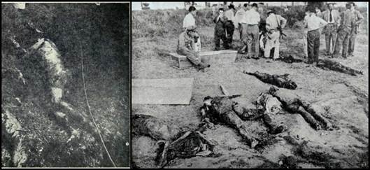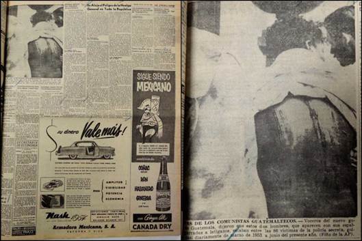 Las 34 imágenes en el libro de Genocidio... y cinco más en el de El calvario... nos permiten señalar la importancia de este hecho; algunas de ellas difundidas en la prensa escrita a partir del 1° de julio de 1954 (Monasterio, 1 de julio de 1954, p. 1; El Espectador, 1 de julio de 1954, p. 16). Las noticias, desde esta temprana fecha, sindicaban la responsabilidad a comunistas apoyados por la Guardia Civil de asesinar a opositores del gobierno. Si bien lo inaudito e inconcebible de estos hechos, contrapuso la pretensión de los liberacionistas de penetrar en la susceptibilidad del público receptor y se cuestionó la manipulación tanto de las imágenes como de la veracidad de las matanzas. En este sentido, el escritor Miguel Ángel Asturias, desde su exilio en Argentina, publicó en 1956 la novela Week end en Guatemala, en la que narra ocho pasajes de la invasión liberacionista. En el capítulo titulado "Cadáveres para la publicidad" expone el recurso utilizado con los muertos para desprestigiar a los "rojos", haciendo uso de los cuerpos que dejó el ejército mercenario (Asturias, 1984, pp. 131-154). Imágenes que en octubre de 1954 reaparecen en los diarios guatemaltecos (El Espectador, 5 de octubre de 1954, p. 1; Secretaría de Propaganda y Divulgación de la Presidencia de la República, 1 de julio de 1954), días antes de que se tipificara el delito de genocidio.