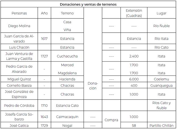 A pesar del declive de la guerra defensiva hacia 1625 y el profundó impacto que tuvo en el Valle del Itata, que sostuvo la complejidad de las relaciones sociales y agudizó los retos a los que se enfrentaron los encomenderos debido a la continua beligerancia y las contiendas por el territorio (Barros Arana, 1872), el espíritu de generosidad no flaqueó. Soldados, oficiales y residentes donaron y vendieron tierras a los jesuitas en el Valle del Itata (Reyes, 1991), como se detalla en la tabla 1. Estas contribuciones fueron cruciales para apoyar la misión jesuita en la extensa área entre los ríos Maule e Itata y satisfacer la necesidad de los ciudadanos de Chillán de tener sacerdotes dedicados a su cuidado espiritual (ANHS. FJ. Vol. 63, foja 156, 1772).