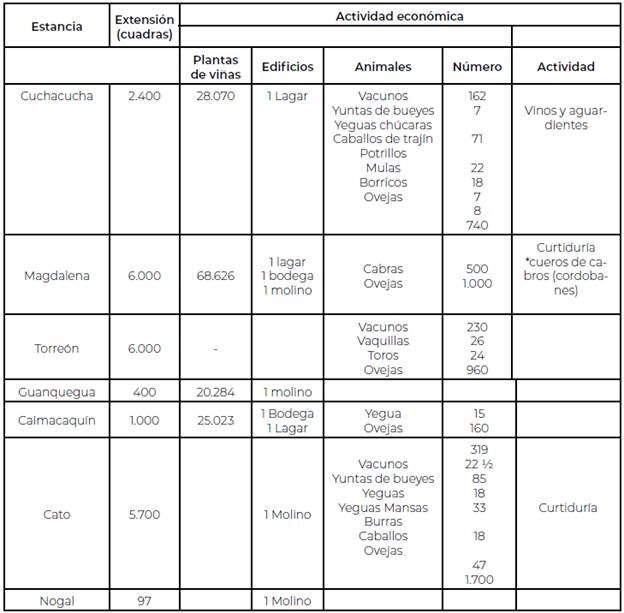Pero las actividades de las estancias no se circunscribían únicamente a la ganadería. En la estancia de La Magdalena se estableció un sistema de procesamiento que posibilitaba la producción de cueros finos, específicamente cordobanes, que encontraban mercado hasta el Perú (Barros Arana, 1872). Esta misma estancia estaba equipada con instalaciones para la vinificación y almacenaje de vino (Olivares, 1875).
