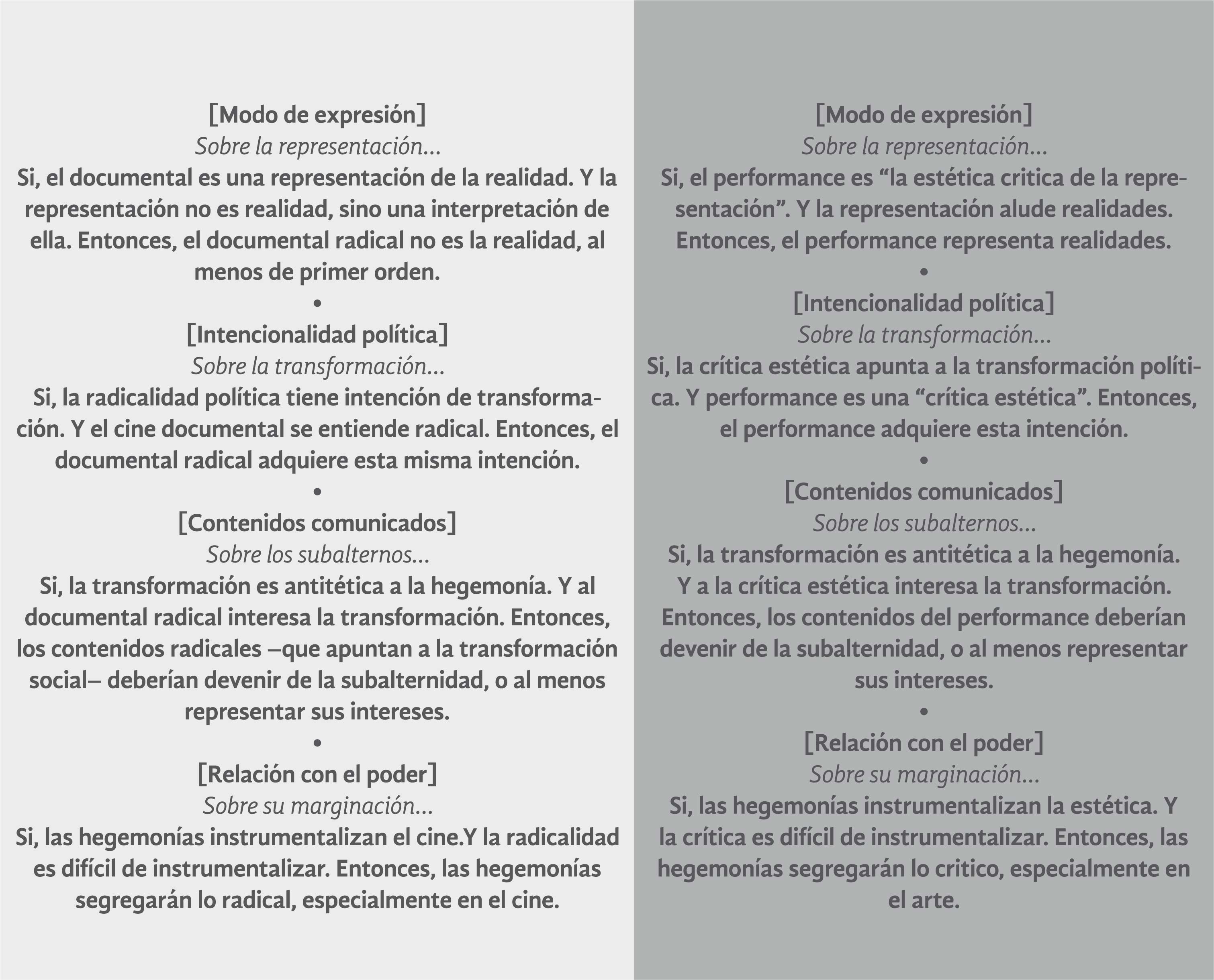 Ya expreso el enfoque representativo-interpretativo desde el cual se entenderá el cine documental en el presente ensayo, es preciso develar el ¿por qué? elegir el performance como elemento análogo al cine documental y no otro tipo de manifestación artística en la cual, también se exprese abiertamente el carácter “simulativo” de su puesta en escena. La razón a esta cuestión subyace en la propia naturaleza del documental escogido, el cual, puede enmarcarse en el denominado documental radical que para Gaines (2007) tiene por fin radicalizar –en términos políticos– a determinados sectores sociales en el campo de la acción, la práctica y la organización, emplazándolos a un posible destino –que se presenta como una posible realidad a construir– cargado de un visible sentido de subversión y emancipación. El cine documental radical nace como un instrumento de sensibilización a la desigualdad, como una herramienta de lucha y concientización a las inequidades propias de la sociedad neoliberal. La analogía entre el arte performance y el documental radical obedece a la necesidad común de representar contenidos propios de marcos social y culturalmente subalternos.