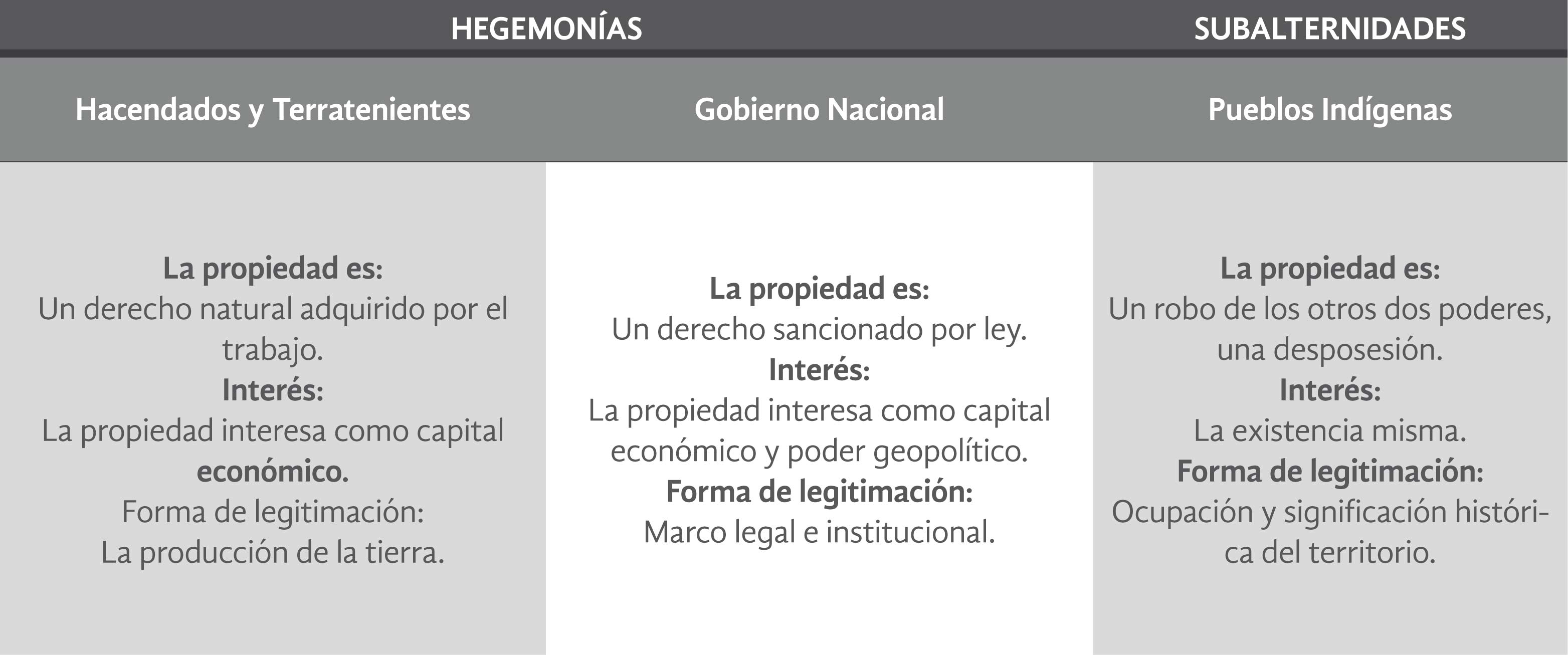 La disputa por el territorio está sujeta a determinados intereses que se hallan anclados a diversas formas de legitimar –discursivamente– los supuestos derechos que las partes en disputa alegan para su control, dicho de otra manera, los sectores sociales que reclaman un determinado territorio se consideran a sí mismos acreedores de este porque la noción de propiedad que defienden los legitima frente a aquellos que también lo reclaman. Si se analiza el discurso a partir de las nociones de propiedad que se exponen en el film –ello, considerando que el reclamo central se avoca al derecho sobre la tierra–, entonces, indudablemente nos tendríamos que remitir a los conceptos discutidos por P. Proudhon (1983) durante el siglo XIX, los cuales, sentaron precedentes de las críticas políticas y económicas –más radicales– de la izquierda del momento, pues, definir la propiedad como un “robo” implicó –de forma no muy implícita– cierto consentimiento a la supresión del Estado y otras privatizaciones como estrategia de liberación. Si bien, el discurso de los demandantes no plantea cosa tal como la “eliminación” del Estado –aunque si, la propiedad privada en manos de terratenientes– los reclamos que se avivan incriminan el intervencionismo de la institución militar y, sobre todo, la poca celeridad otorgada al proceso de demarcación de tierras, lo cual, deja entrever la posición hegemónica del Estado frente a estos grupos, ello, en términos facticos, es decir, más allá de los discursos manifiestos (ver cuadro 2).