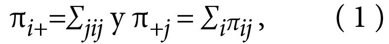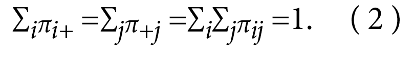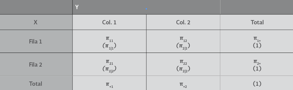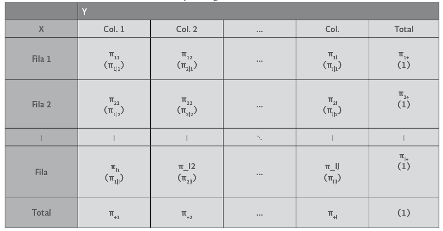 Cuando se tienen datos de tipo categórico, una manera de presentar la relación entre las variables es a través de tablas de contingencia. Sean las variables categóricas X y Y, con I y J niveles, respectivamente. Si se divide la frecuencia reportada en cada celda (nij) entre el tamaño de la muestra (n) se obtienen las probabilidades de que una respuesta pertenezca a la categoría (i,j), de manera que πij=nij ⁄ n. Sea πij=P(xi,yj) la distribución de probabilidad conjunta de (X,Y), esto es, la probabilidad de que la respuesta (xi,yj) ocurra en la celda (i,j) con i=1:I y j=1:J; mientras que las distribuciones marginales están dadas por los totales por fila y columna, denotadas por {πi+ } para la suma por fila y {π+j } para la suma por columna, cumpliéndos