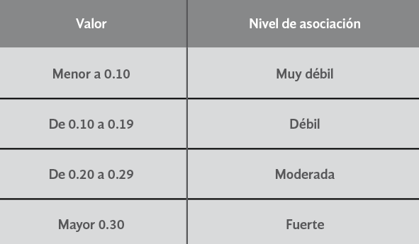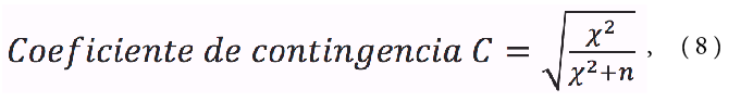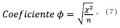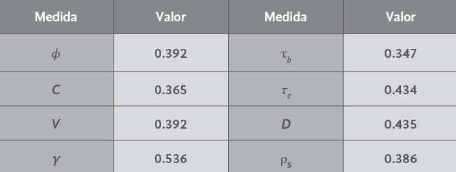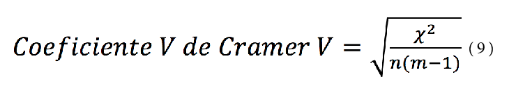 ( 9 )De Visauta (2007) se tienen algunas observaciones sobre estas medidas. En tablas 2x2, el valor de ϕ y V es idéntico al coeficiente de correlación de Pearson. Si el número de filas o de columnas es superior a 2, entonces ϕ puede ser superior a la unidad. El problema con el índice V de Cramer es que tiende a subestimar el grado de asociación entre las variables.