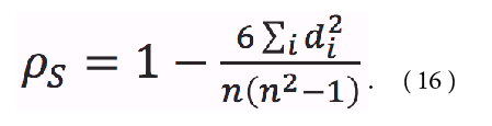 ( 15 )Si los datos no cumplen el supuesto de normalidad, resulta apropiado calcular el coeficiente de correlación ρS de Spearman. Nuevamente el valor absoluto representa la fuerza de asociación, y el signo la dirección; su ventaja radica en la robustez ante valores extremos. Para obtenerlo, primero se ordenan los datos de X y Y y se reemplazan por su respectivo orden; sea d la diferencia entre los correspondientes estadísticos de orden de xi-yi por lo que se define como