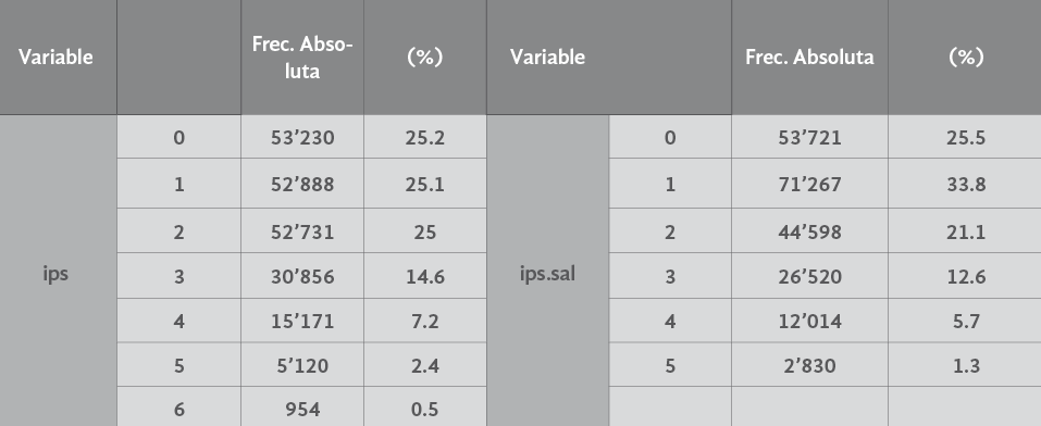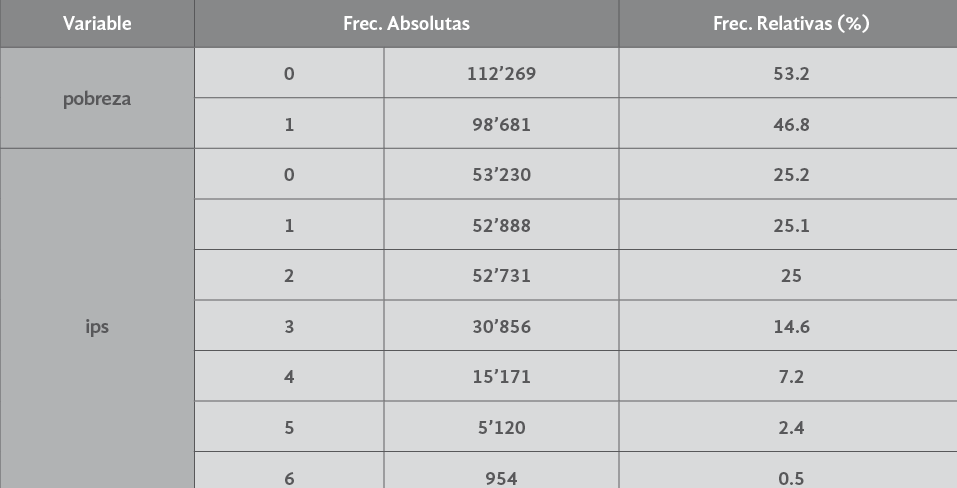 En la muestra con ingresos acotados hay un total de 210'950 observaciones, de las cuales 47.3% son pobres multidimensionales y 52.7% son pobres de ingresos; tal como lo señala el Cuadro 5. De las frecuencias de los valores del IPS, observe que el 50.3% de la muestra padece una o dos carencias. La carencia más padecida por la población es la de acceso a seguridad social seguida del acceso a la alimentación; la menos padecida es la de condiciones y espacios de la vivienda.