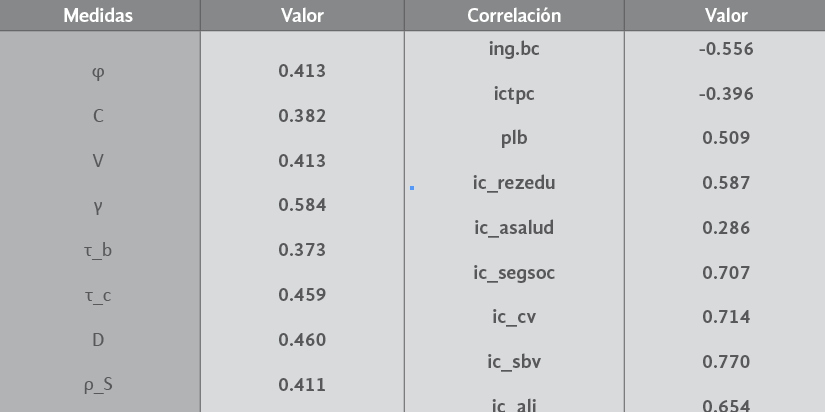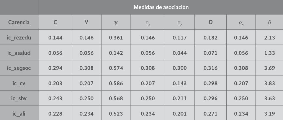 Las medidas C y V señalan la existencia de una moderada asociación entre la pobreza de ingresos y las carencias. Para el acceso a servicios de salud se reporta un nivel muy bajo (0.056), mientras que el mayor se da en acceso a seguridad social (0.308), para cualquiera de estas dos medidas. Por otro lado, las medidas direccionales (γ, τb, τc, D y ρS) indican que la pobreza de ingresos se asocia positivamente con la presencia de las carencias, incluso para el acceso a los servicios de salud. El orden de menor a mayor asociación varían ligeramente en las primeras 7 medidas; mientras que los valores de θ reportan una ordenación distinta, pero las de mayor valor siguen siendo las variables de servicios básicos en la vivienda, condiciones de la vivienda y acceso a seguridad social.