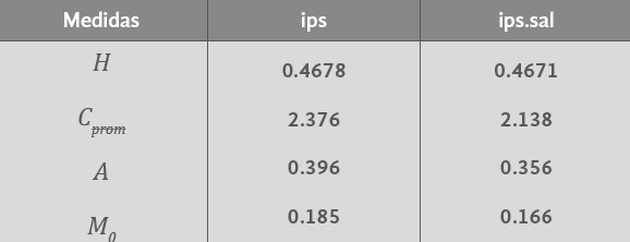 En el Cuadro 12 se muestran los valores de las medidas de asociación que resultan de usar la pobreza de ingresos y el IPS modificado (plb e ips.sal), así como las correlaciones de ips.sal con las otras variables. Nótese un incremento en todas las correlaciones, salvo en el caso del acceso a seguridad social (ic_segsoc). Ante la eliminación de la carencia de servicios de salud, la correlación entre el nuevo IPS y el ingreso se incrementa, sobre todo para el ingreso transformado (ing.bc). Al obtener las medidas de asociación, en todos los casos se encuentra un valor mayor, mostrando una mayor relación entre el espacio de los ingresos y el espacio de los derechos sociales.