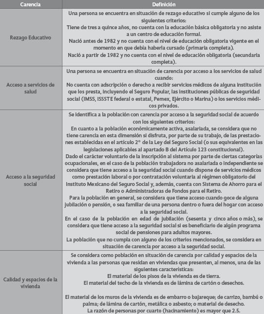 En México, de acuerdo con CONEVAL, un individuo se define como pobre multidimensional si es carente tanto en el espacio de los ingresos como en el de los derechos sociales. El indicador que se asocia al espacio de los ingresos es el ingreso corriente total per cápita. El espacio de los derechos se define a través de seis indicadores de carencias: rezago educativo, acceso a los servicios de salud, acceso a la seguridad social, calidad y espacios de la vivienda, servicios básicos de la vivienda y acceso a la alimentación.