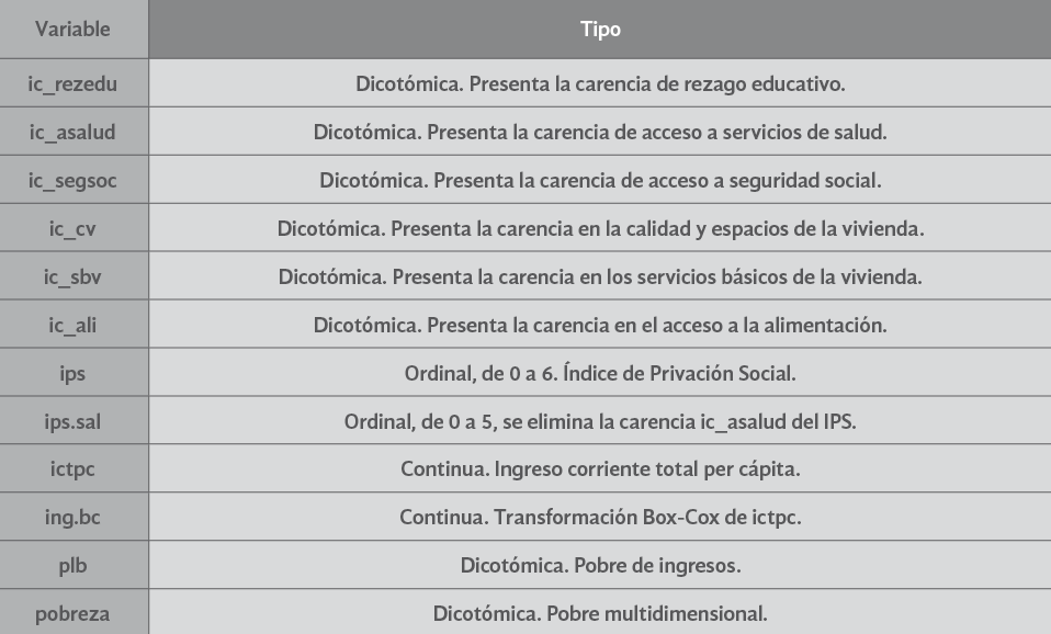 En el Cuadro 4 se presentan los nombres de las variables a emplear en el resto del documento, además de especificar el tipo de variable. Estos datos se obtuvieron de la base brindada por CONEVAL del MCS de la ENIGH 2012 en su página oficial para el cálculo de la pobreza multidimensional (excepto ing.bc e ips.sal).[10] Si bien el ingreso es el mismo para todos los integrantes de un hogar, cada uno puede presentar un diferente nivel de carencias, es por ello que en México el estudio de la pobreza multidimensional se realice a nivel individual. En adelante, se hablará de carencias para referirse solamente a la condición de carencias en el espacio de los derechos sociales.