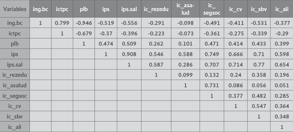 Otro elemento de interés son las correlaciones entre variables, las cuales se presentan en el Cuadro 6, donde todas las correlaciones resultaron significativas al 99% de confianza. Existe una correlación negativa entre el ingreso, más acentuado al considerar el ingreso transformado, y el Índice de Privación Social, siendo de -0.370 y -0.519, respectivamente. De igual manera, ante un incremento en el ingreso se presenta una reducción en la probabilidad de padecer las carencias, el mayor valor se da entre el ingreso y la seguridad social (-0.491). La variable pobreza de ingresos, plb, también presenta niveles moderados de correlación, siendo la más alta con el acceso a la seguridad social (0.471) y la menor con el acceso a los servicios de salud (0.101). Precisamente, el acceso a servicios de salud y a la seguridad social son las variables con mayor correlación entre sí (0.731), considerando la baja asociación reportada por el acceso a servicios de salud con las demás carencias. Se observa también una moderada asociación entre las carencias asociadas a la vivienda, alcanzando 0.547.