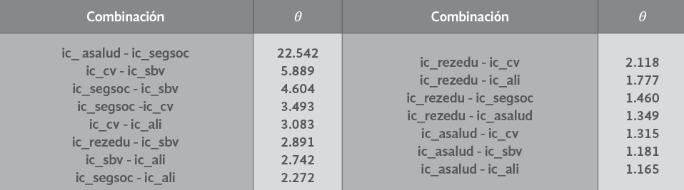 Un elemento que también debiera de ser tomado en cuenta es la potencial asociación entre las carencias que conforman el mismo espacio de los derechos sociales. De existir asociación entre estas variables se afectan los resultados al calcular su relación con la variable de pobreza por ingresos. Por ello en el Cuadro 8 se muestran las razones de posibilidad de las quince combinaciones resultantes de elegir dos a dos las carencias. Los niveles más altos se reportan en las carencias de acceso a servicios de salud y a seguridad social (ic_asalud e ic_segsoc), seguidos de condiciones y servicios básicos en la vivienda (ic_cv e ic_sbv). Respecto del primer caso, esto se debe a cómo se formulan las carencias desde la LGDS; y en el segundo caso se debe a que ambas variables son complementarias en la descripción de una vivienda. Por otro lado, las variables que reportan asociaciones más débiles son el rezago educativo y el acceso a servicios de salud (ic_rezedu e ic_asalud).