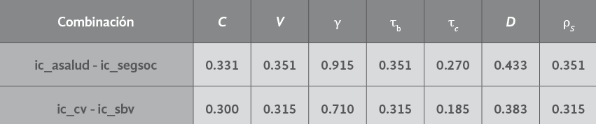 Las medidas de asociación para las combinaciones ic_asalud-ic_segsoc y ic_cv-ic_sbv se reportan en el Cuadro 9. Se destaca que el nivel de concordancia en es una asociación positiva muy clara, implicando que sufrir una carencia aumenta la probabilidad de padecer la otra, sobre todo entre ic_asalud y ic_segsoc. El valor de la D de Somers que se reporta es el valor más alto, el cual ocurre cuando el acceso a la seguridad social y los servicios básicos en la vivienda (ic_segsoc e ic_sbv) se establecen como dependientes. La fuerte asociación encontrada entre las carencias invita a analizar cuáles de ellas sería conveniente dejar en el índice de privación.
