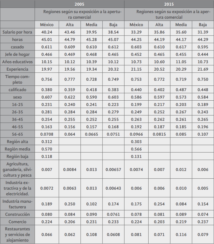 En esta sección se presenta la estructura ocupacional y salarial del mercado laboral mexicano y sus diferentes regiones, según su exposición a la apertura comercial en 2005-2015. El cuadro 1, revela que, en términos salariales, la remuneración promedio por hora ha caído en la década en todo el país y en cada una de las regiones. A nivel espacial, se observa que en la región de alta exposición a la apertura se cuenta con un mayor salario por hora, aunque en esta zona es donde se experimenta una mayor caída (43.46 a 35.86), respecto al resto del país. De igual manera, se encontró que la proporción de jefe de hogar, oscila alrededor de 45.0 puntos porcentuales y se mantiene relativamente sin cambios, al igual del estatus civil, donde poco más del 60.0 por ciento de los trabajadores es casado. Por otra parte, el promedio de años de educación se mantiene constante, aunque, son los trabajadores ubicados en la región de baja exposición, donde se observan mayores años educativos con 11.05 en promedio en 2015. La variable experiencia muestra un ligero aumento de 2005-2015 en todas las regiones de estudio, al pasar a más de 20 a 21 años promedio.