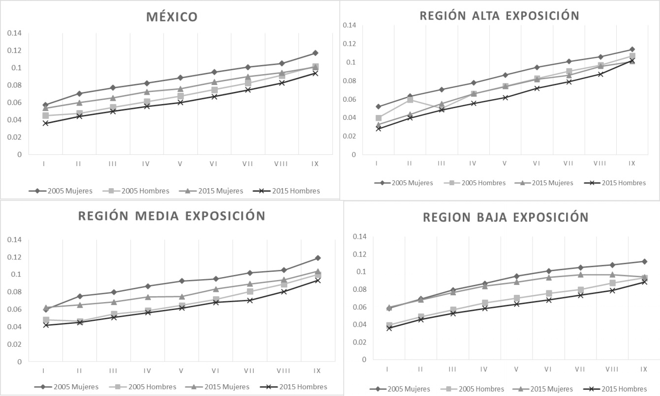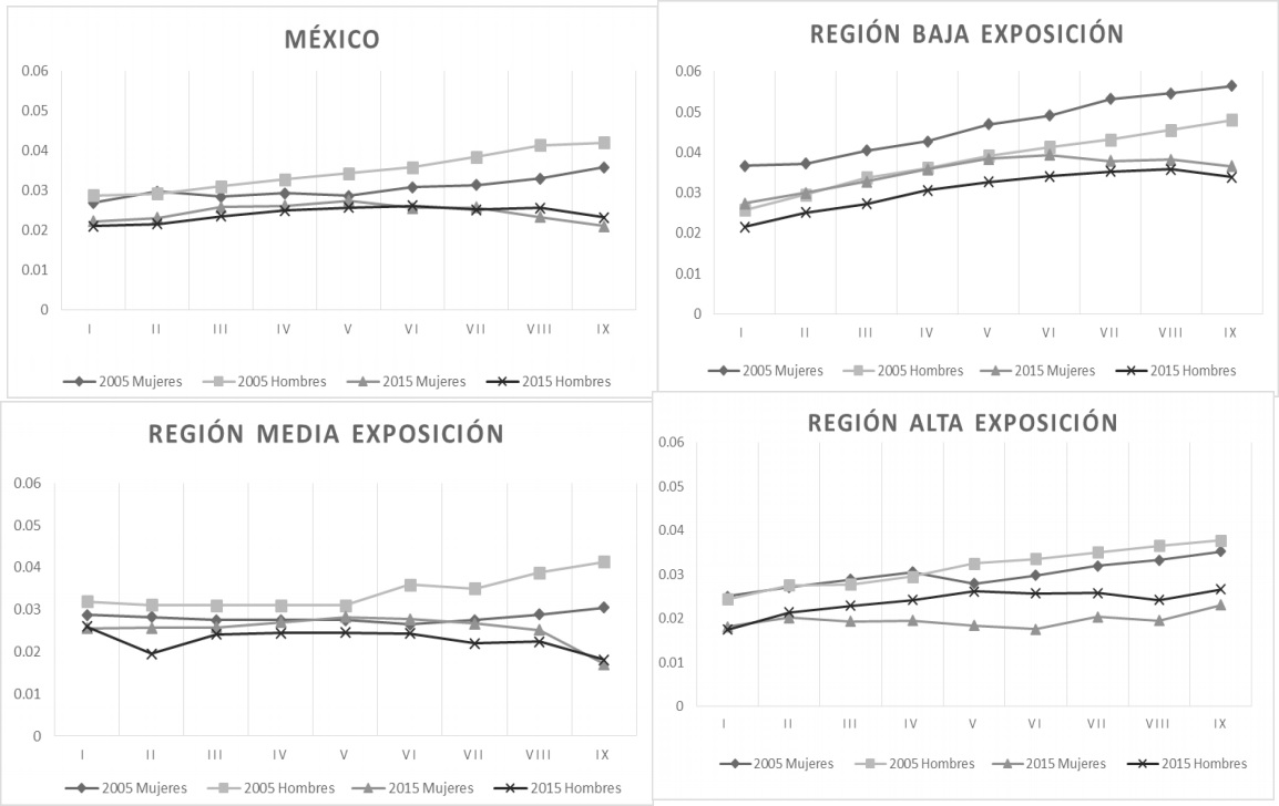 El análisis por regiones, revela que en la zona de alta exposición el premio a la educación de las mujeres en 2015, son similares al grupo de hombres de 2005, en los cuantiles IV al VIII. Por su parte, en las regiones de media y baja exposición se observa que los coeficientes de hombres de 2005 tienden a igualarse con ese mismo grupo en 2015, en diferentes tramos de la distribución, como es el caso de la región de media exposición en los cuantiles II al VI y en la región de baja exposición en los primeros I y II, así como en el último cuantil.