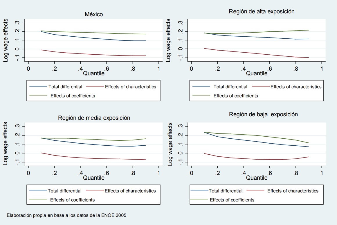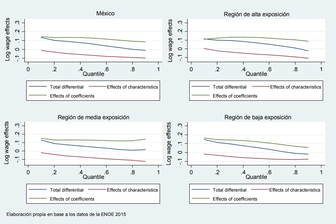 Al analizar al interior de las regiones se revela que, en la zona de alta y media exposición a la apertura comercial, se observa un aumento en la parte no explicada al avanzar en los cuantiles de salario, sucede lo contrario a nivel nacional y en la región de baja exposición, ya que se revela una reducción en la parte de los coeficientes, lo que implica que hay una aumento en el valor de las características a favor de las mujeres.