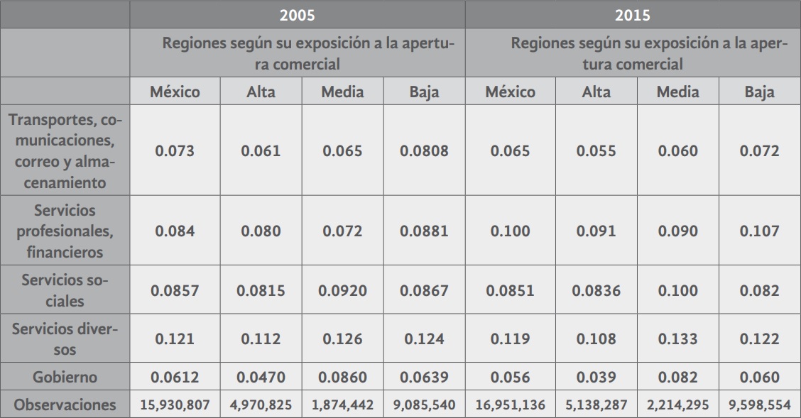 Se encontró, que existe una mayor proporción de trabajares en la región de media exposición con más del 50.0 por ciento, esta proporción se mantiene relativamente sin cambios en 2015. Los sectores económicos con mayor peso son la industria manufacturera, el comercio y los servicios diversos. A nivel regional es importante resaltar que, en la región de alta exposición, es donde se concentra la actividad manufacturera del país con más del 25.0 por ciento en el periodo de estudio.