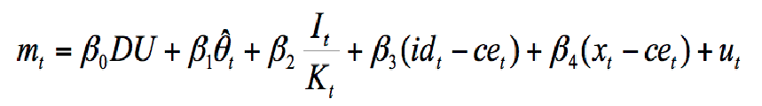 We assume that output fluctuates around capacity over the long-run, so the actual utilization rate of economic capacity also fluctuates around some desired or normal utilization rate of economic capacity (µ*=1). Hence the following equation: