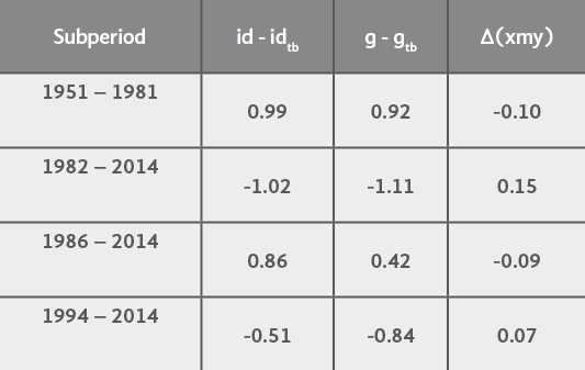 With the aim of checking the robustness of our results, we contrast the differences between id and idtbI and between g and gtbI with the annual average change of the trade balance as a percentage of GDP, ∆xmy (see table 5). It can be readily seen that when the effective values are higher (lower) than the values consistent with a constant position of the BoP as a percentage of the GDP, the annual average change of the trade balance as a percentage of the GDP is negative (positive). It is worth noting that during 1982-2014 the Mexican economy has grown a bit more than 1% less than the growth rate which is consistent with a constant position of the BoP as a percentage of the GDP.