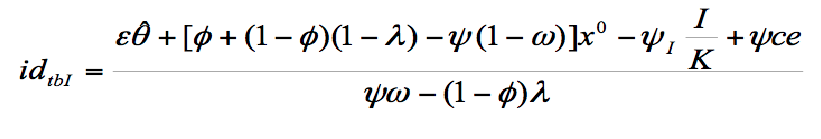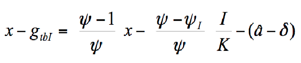 Moreover, using equation (17) it can be shown that the ratio X/Y does not just depend on ψ; it also depends on ψI, x0, I/K, and δ. Suppose the trade balance is in equilibrium (it means that ϕ=1), that the external demand for domestic goods tends to zero (it means that (1-λ) and (1-ω) tend to zero) and that θ is constant. Under these conditions, when the economy grows at the value given by gtbI, the growth rate of the ratio X/Y will be equal to: