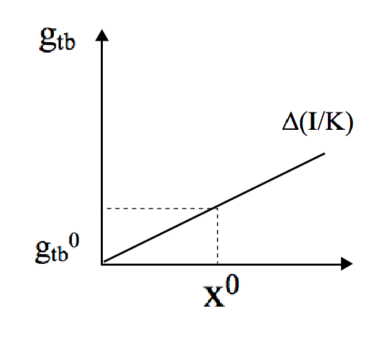 where σ stands for capital productivity. It can readily be seen that, since (W/P) is given, σ is also given. Therefore, X and Y proportionally depend directly on K. Now, suppose that the real exchange rate, defined as the price ratio of domestic output to imported capital goods (P/P*), is given. This implies that the profitability rate (r) in terms of (P*) is also given, because (W/P) is fixed. Assume, further, that the growth rate of capital is composed of two parts, an autonomous component () and an induced component which depends on r: