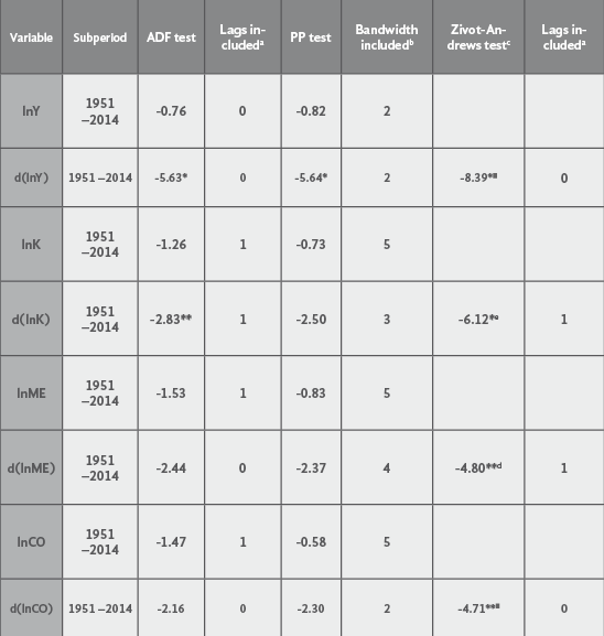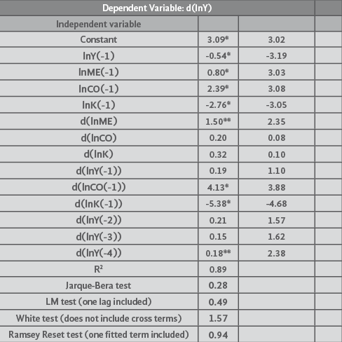 As seen in Table B.2 above, all the series, lnY, lnK, lnME and lnCO, are I(1). We used the bound test approach to cointegration (see Pesaran, Shin and Smith, 2001). First, we ran an unrestricted error correction model; the estimated results are presented in Table B.3.