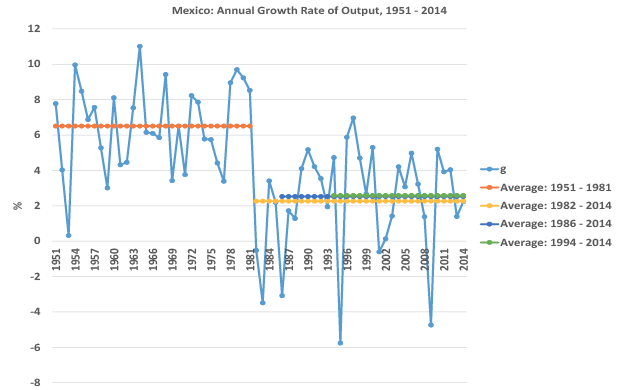 Graph 1, below, shows the output performance of the Mexican economy from 1951 to 2014. On average, the growth rate of Mexico’s GDP averaged 6.51% during 1951-1981, a period that encompasses the golden age of the country´s industrialization (1940-1970), the loss of macroeconomic stability in the seventies and the oil boom period (1978-1981) (Moreno-Brid and Ros, 2009). Mexico’s economic activity lost momentum after the foreign debt crisis of 1982: the average growth rate of GDP declined to 2.27% in 1982-2014. Moreover, the North American Free Trade Agreement (NAFTA) only brought an average growth rate of output equal to 2.59% during 1994-2014.[7] The economic liberalization strategy has hitherto failed to deliver a higher growth rate of GDP commensurate with that of the import substitution industrialization era.