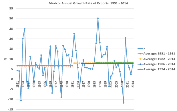 According to the balance-of-payments constrained growth approach, the sharp deceleration of Mexico’s output growth rate can be looked upon in two ways. One is through a decrease of the growth rate of exports; the other is through an increase in ψ (cf. Moreno-Brid, 1998b and 1999; López and Cruz, 2000 and Guerrero de Lizardi, 2006). As far as exports is concerned, the data say that their average growth rate, though slightly, did increase throughout the trade liberalization period vis-á-vis the import substitution industrialization epoch: exports grew at an average annual rate of 7.94% during 1982-2014, at 7.73% during 1986-2014 and 8.34% from 1994 to 2014, compared to 6.65% during 1951-1981 (see graph 2). Thus, a faster average growth rate of exports coincided with a slower growth rate of GDP during 1982-2014, while output growth acceleration overlapped with (slightly) lower exports.