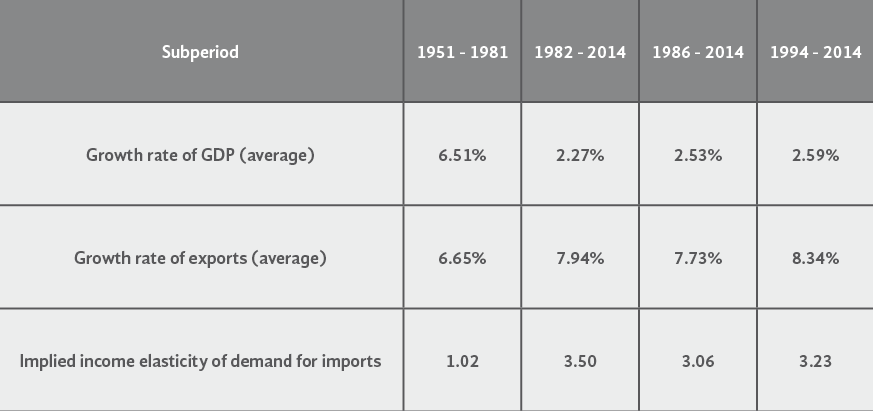 Now, determining -in a very simple way- a value of ψ consistent with a dynamic BoP equilibrium, we divide the growth rate of exports by the effective growth rate of GDP[8]. It can be shown that the implied ψ was 1.02 during 1951-1981, 3.50 during 1982-2014, 3.06 in 1986-2014 and 3.23 during 1994-2014 (see table 1). Therefore, the income elasticity of demand for imports consistent with a dynamic BoP equilibrium more than tripled after the foreign debt crisis of 1982.