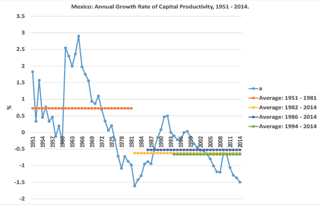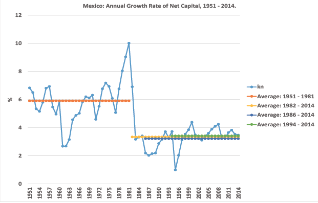 Yet, as mentioned above, according to our model both capital accumulation and the growth rate of capital productivity are also important in determining the long-run growth rate of the economy. As can be seen from graph 3, the growth rate of net capital followed the same pattern of behavior as the growth rate of GDP: its annual average growth rate was 5.91% during 1951-1981, 3.34% in 1982-2014, 3.22% during 1986-2014 and 3.41% during 1994-2014. After the foreign debt crisis of 1982 the path of net capital accumulation faltered, it fell down 2.57 percentage points, and the NAFTA did nothing to improve it.