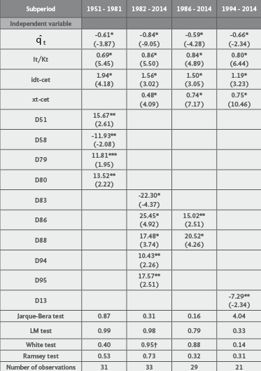 First and foremost, according to our empirical estimations, contrary to some received accounts for the sharp deceleration of Mexico’s growth rate of GDP after the debt crisis of 1982 and the advent of trade liberalization in the late 1980s, a more accurate elucidation of the dismal performance of the Mexican economy must embed the interaction of the balance-of-payments constraints elements and the influence of capital accumulation. Our empirical results show that y increased from 1.94 to 2.23 between 1951-1981 and 1986-2014, although during the NAFTA sub-period it went down to 1.94 again. Moreover, the gross capital elasticity of demand for imports -not relevant in the balance-of-payments constrained growth model- remains more or less constant throughout the whole period under analysis. Likewise, the autonomous growth rate of the demand for imports, measured by the Dummy variables, and the rate of annual variation of the real exchange rate are not very important in the determination of idtbI and gtbI; their contributions are lower than one percentage point for each of the subperiods considered (see table 3). Hence, it can be argued that the increase in y contributes to explain the slowdown of Mexico’s GDP growth beyond the debt crisis of 1982, but such increase in y does not explain the whole story.