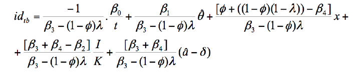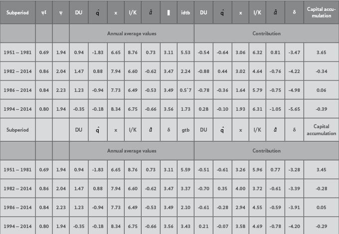 where t indicates the number of years of each subperiod for which the econometric model was run. In order to derive gtbIwe just use equation (17). Our estimations for ψI, ψ, idtbI and gtbI for each subperiod using the annual average values of β0, , x, I/K, , δ, ϕ and λ are shown in table 3.