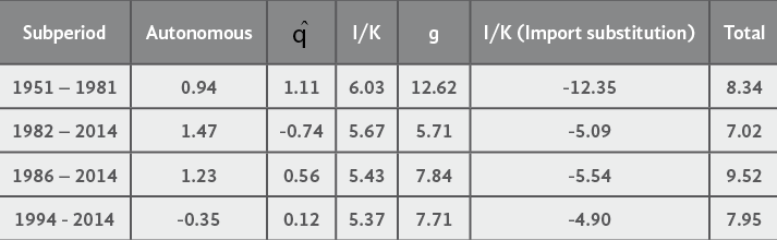 Another way of looking upon the importance of capital accumulation in the determination of gtbI stems from the disaggregation of the determinants of m. Table 4 shows that the autonomous growth rate of the demand for imports is positive, although low, for all the subperiods, except for the NAFTA one in which the annual average value is -0.35%. The real exchange rate, in turn, exhibits a low effect in the determination of the growth rate of the demand for imports for each of the subperiods under analysis. Given that the income elasticities of the demand for imports for each subperiod is almost the same, it is normal to see that the growth rate of the demand for imports, derived from the growth rate of income, was lower after the debt crisis of 1982. Lastly, the net effect of capital accumulation on the demand for imports was negative during 1951-1981 (-6.32%), but positive during 1982-2014 (0.58%). It is important to bear in mind the behavior of the income and gross capital accumulation elasticities of the demand for imports, if one is to understand that the problem of the Mexican economy was a sharp reduction in the net capital accumulation and the growth rate of capital productivity, combined with an increase in y.