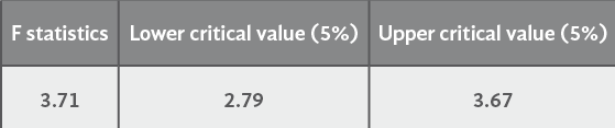 Now, we compute the F-statistics for the null hypothesis that all the parameters of the dependent and independent variables in levels in table A.2 are equal to zero and such value is compared with the critical value reported in Pesaran, Shin and Smith (2001) for the case of a cointegration relationship with unrestricted intercept and no trend. As shown in table B.4, we can accept the existence of a cointegration relationship between lnY and lnK, lnME and lnCO given that the F – statistics computed is higher than the upper critical value.