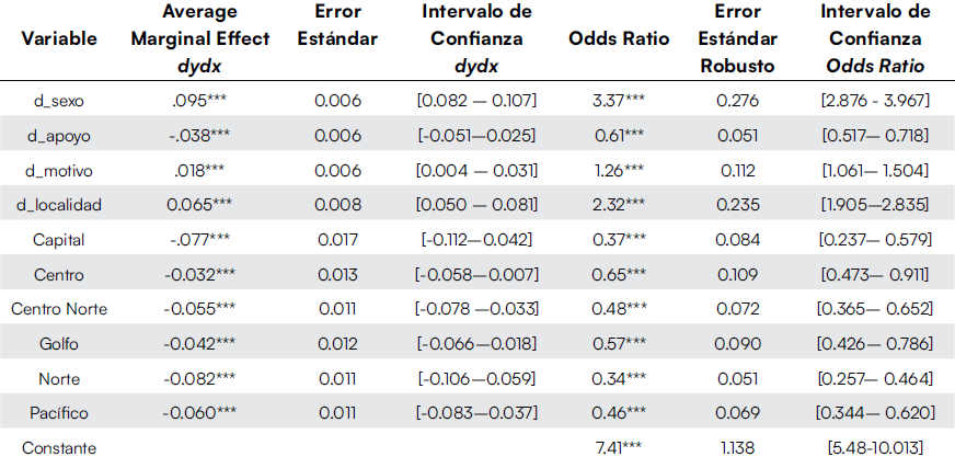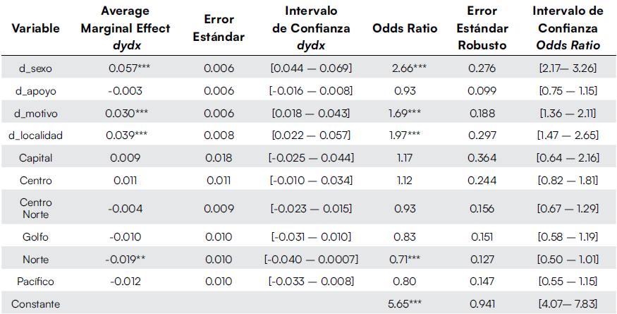 Los cambios marginales muestran que los hombres con respecto a las mujeres tienen 9.5% más de probabilidad de participar en el trabajo infantil. Por su parte, las niñas(os) y adolescentes al recibir un apoyo económico exhiben una probabilidad de 3.8% menos de encontrarse inmersos en un empleo prohibido, riesgoso o en trabajo doméstico realizado en condiciones no adecuadas. Cuando los menores y adolescentes tiene que aportar o apoyar económicamente en el hogar donde viven, aumenta la probabilidad de participación en 1.8%. Por su parte, las niñas(os) y adolescentes que residen en zonas de menos de 2,500 habitantes reportan una probabilidad de 6.5% mayor de encontrarse en situación de trabajo infantil. En cuanto a los cambios marginales que exhiben las variables regionales, se aprecia que en todos los casos los signos son negativos. Es decir, en todas las regiones con respecto a la de referencia (Sur), disminuye la probabilidad de emplearse. En la Capital disminuye en 7.7%, Centro 3.2%, Centro Norte 5.5%, Golfo 4.2%, Norte 8.2% y Pacífico en 6%. El mayor impacto se observa en la región del Norte, un espacio que también arroja resultados significativos en 2019.