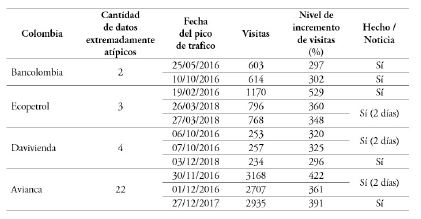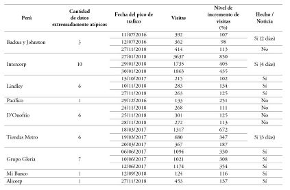 Finalmente, en cuanto a la reactividad, la tabla 5 presenta datos y el resultado de la asociación entre datos atípicos con hechos noticiosos. Se seleccionaron los tres valores extremadamente atípicos más altos en los casos en que los que se presentaron. En total, se encontraron 244 datos de este tipo en 33 empresas. La excepción se presentó en seis empresas de Colombia y una de Perú. De estos datos, se revisó su posible relación con hechos noticiosos en las 88 fechas de mayor nivel de tráfico del rango escogido (26 de Chile, 11 de Colombia, 30 de México y 21 de Perú). También se determinó el porcentaje de incremento del tráfico en cada fecha con respecto a la media diaria de los tres años analizados (Columna 5).