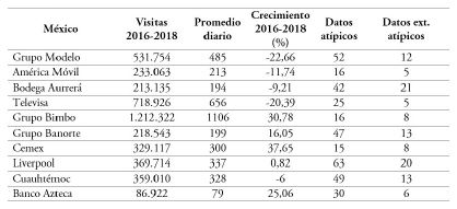 Los resultados muestran que en ciertas fechas el número de visitas está alejado numéricamente de las medidas de tendencia central (promedio, cuartil 1, mediada y cuartil 3). Estos resultados fueron corroborados en diagramas de cajas y bigotes, de los cuales se muestra como ejemplo el de las empresas de México, el conjunto con mayor presencia de este tipo de datos (figura 1). Dicho diagrama es una representación visual que describe características importantes de los datos en forma integrada: dispersión, simetría y distribución por cuartiles. Dichos gráficos, además, muestran la escala de dispersión de los datos atípicos y una cantidad aproximada de estos.