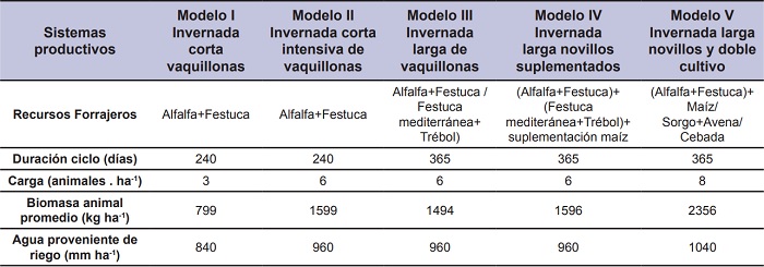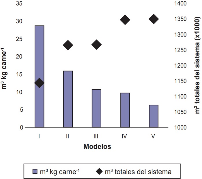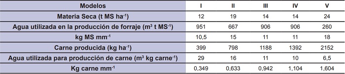 Los Mi y ii estacionales son menos eficientes en la utilización del agua para la producción de carne que los modelos anuales (iii, iv y v) aunque el consumo total de agua no varió significativamente entre modelos.