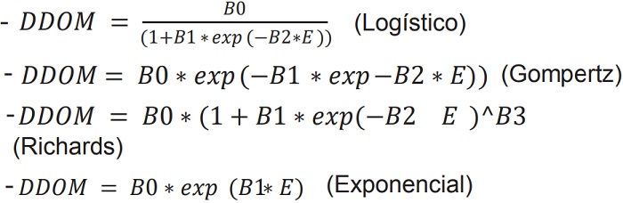 Para el ajuste se agruparon las parcelas según su calidad de sitio. Se ajustaron cuatro modelos de predicción de diámetro medio dominante mediante regresión no lineal con el software InfoStat (Di Rienzo et al., 2017), se consideró DDOM como variable dependiente, la edad (E) como variable independiente para cada calidad de sitio. Los modelos ajustados fueron: