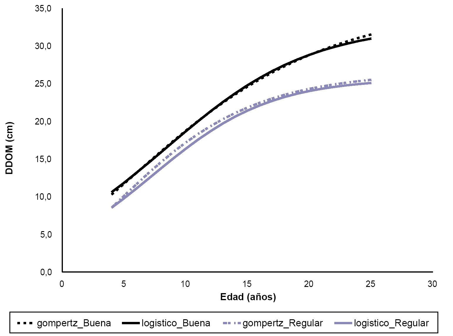 En la figura 2, se pueden observar las curvas de los modelos ajustados para cada grupo de calidad de sitio. En promedio, la brecha de crecimiento de DDOM a los 5 años es de 2 cm mientras que a los 23 años es de 6 cm aproximadamente.
