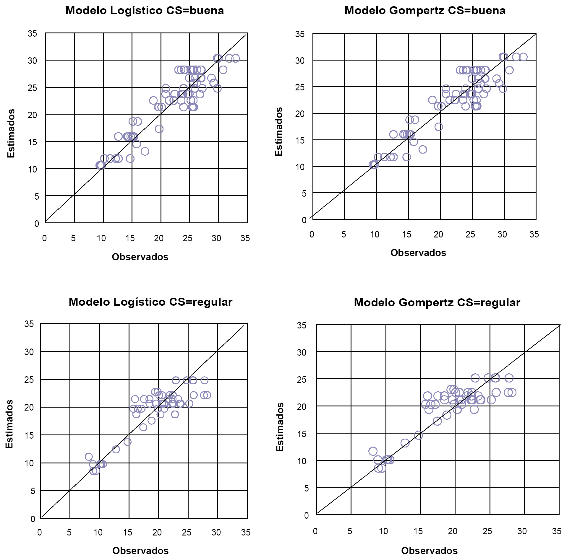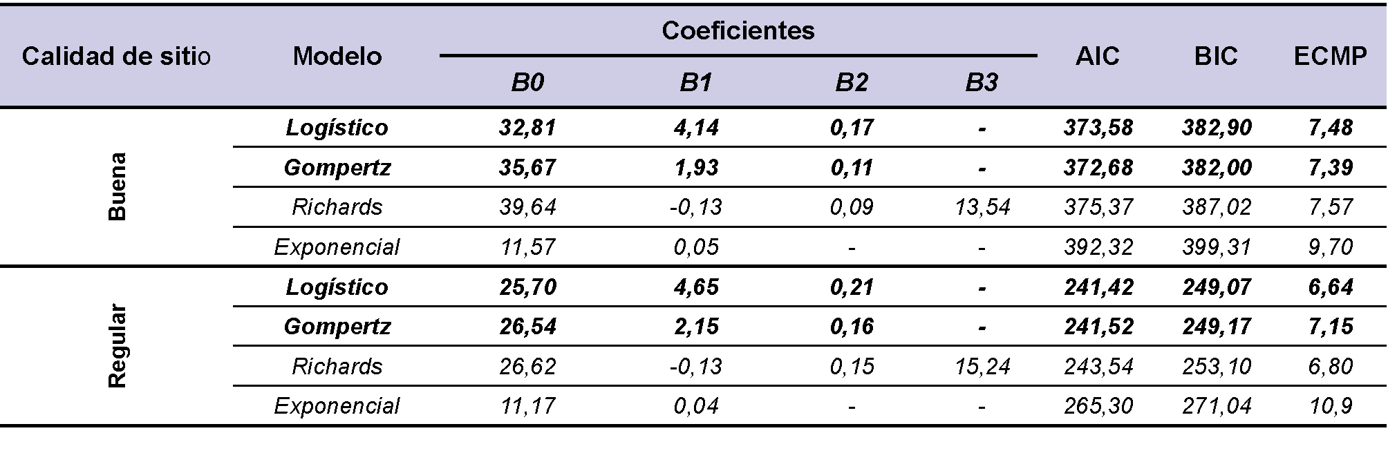 Debido a que no se cuentan con datos en todas las calidades de sitio y edades, se decidió agrupar las clases “regular y mala en “regular” y las clases “bueno y muy bueno” en “bueno”. Los modelos Logístico y de Gompertz para ambas calidades de sitio mostraron los mejores ajustes teniendo en cuenta los menores valores de ECMP, AIC, BIC y menor cantidad de variables (tabla 4), de esta forma, ambos pueden emplearse en la zona de estudio para estimar el diámetro de los ejemplares dominantes tomando como base la edad de la plantación y la calidad de sitio.