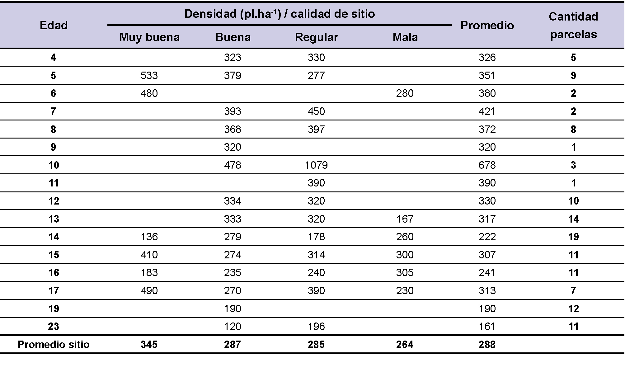Teniendo en cuenta que el objetivo de las plantaciones es la producción de madera para aserrío, las densidades observadas fueron altas para todas las edades, particularmente en las mejores calidades de sitio (tabla 1) en comparación con lo observado por Delvalle (2006) para plantaciones de 10 años o más. Por ello, es probable que el crecimiento sea mayor si las plantaciones estuvieran sujetas a regímenes de manejo acordes a la calidad de sitio y al objetivo de producción.